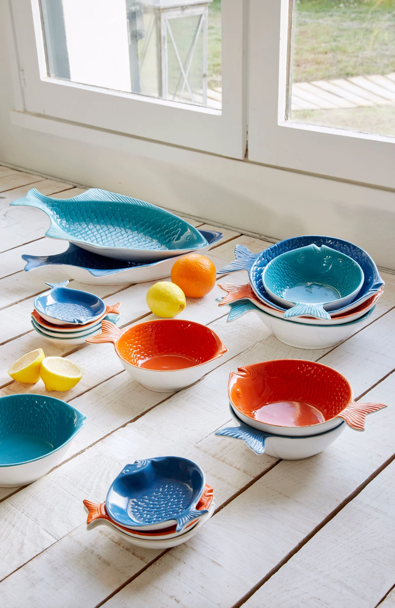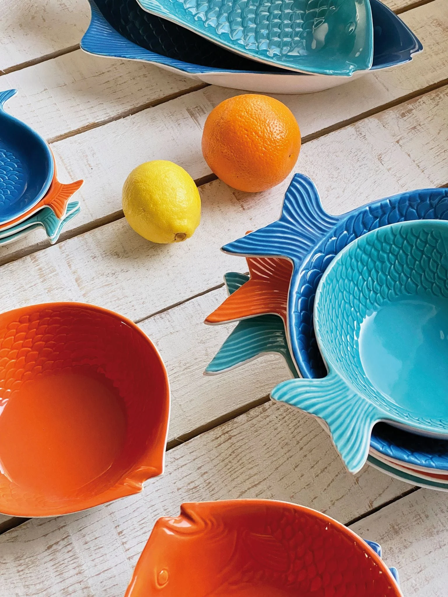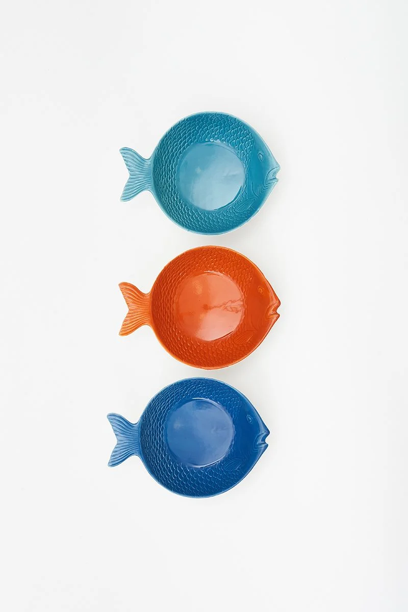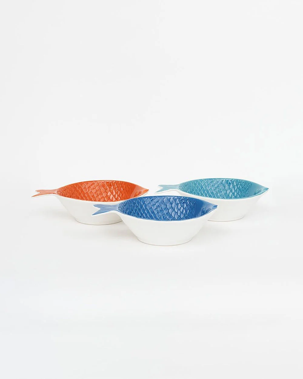 Κεραμικό μπολ σε σχήμα ψαριού. Το εξωτερικό είναι λευκό και το εσωτερικό του καθενός είναι σε διαφορετικά χρώματα: τιρκουάζ, ναυτικό και πορτοκαλί.