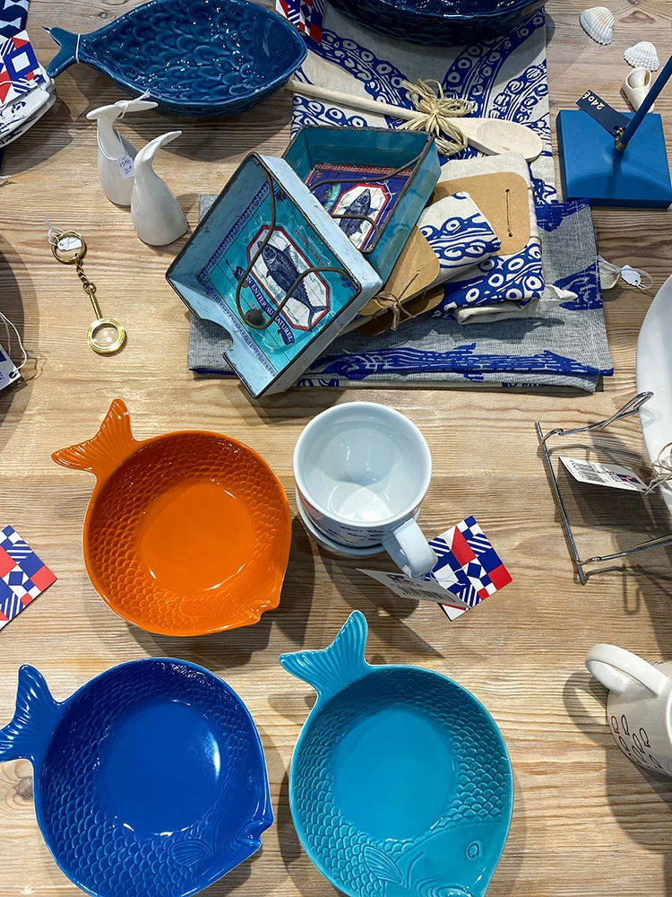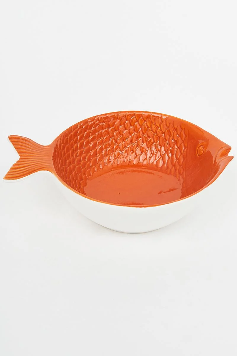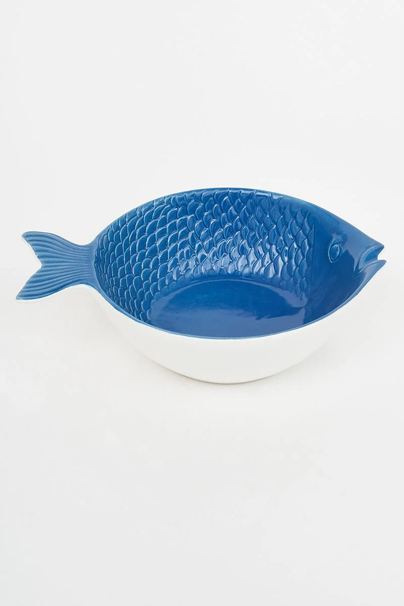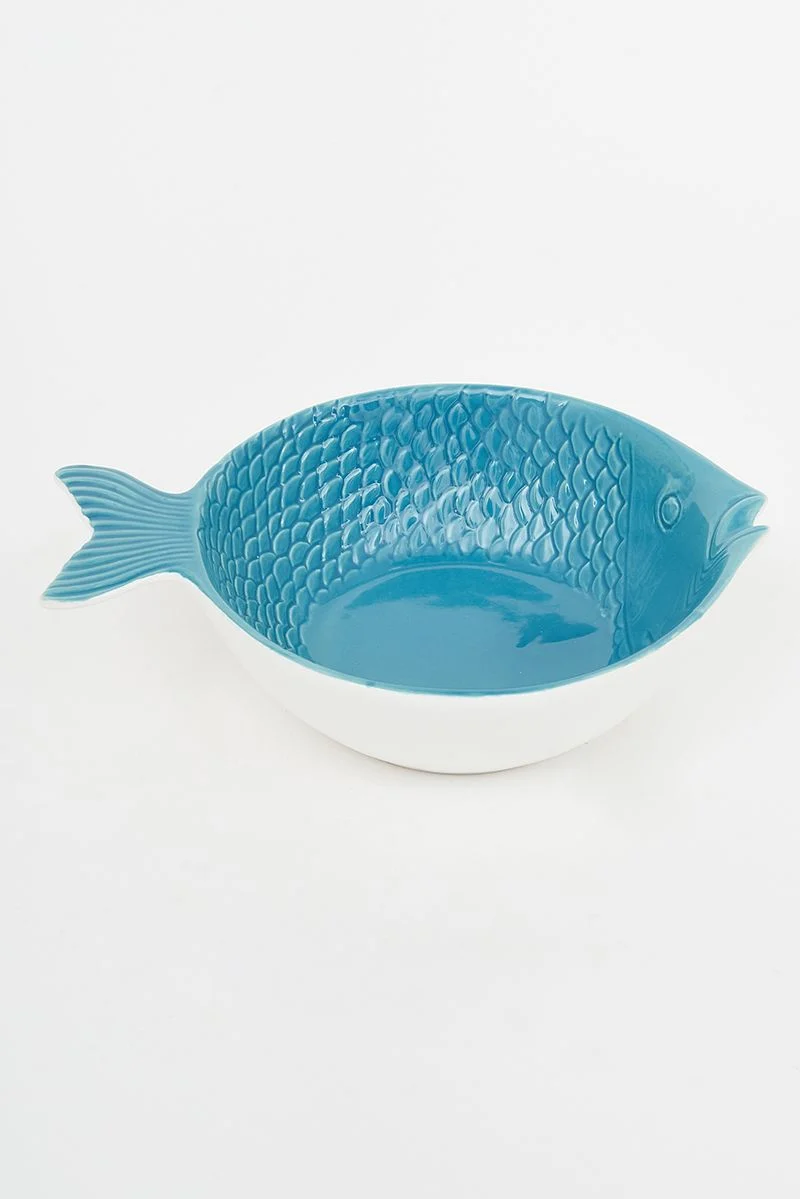 Κεραμικό μπολ σε σχήμα ψαριού. Το εξωτερικό είναι λευκό και το εσωτερικό του καθενός είναι σε διαφορετικά χρώματα: τιρκουάζ, ναυτικό και πορτοκαλί.